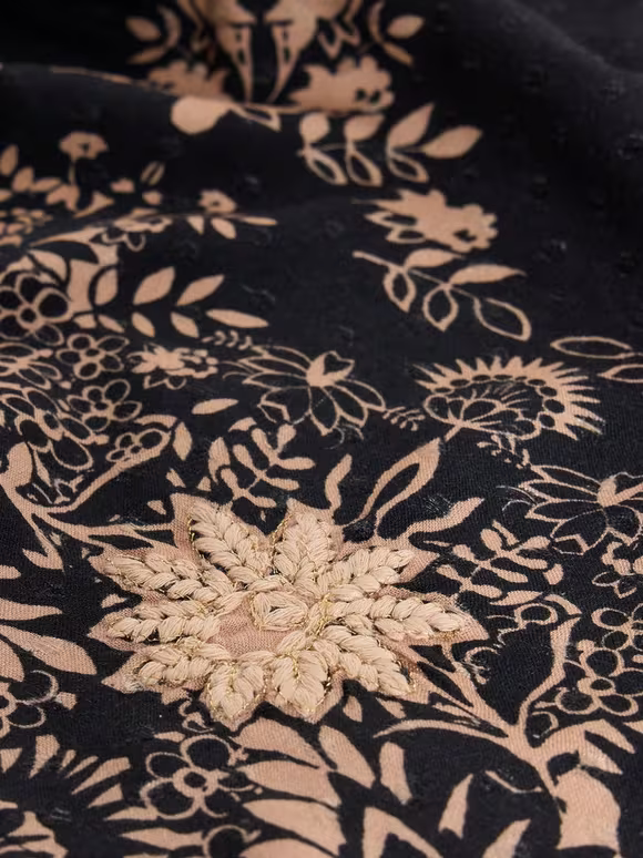 - MAIN: 100% Viscose ,EMBROIDERY 1: 71% Polyester, 29% Metalised FibreEMBROIDERY 2: 100% Polyester